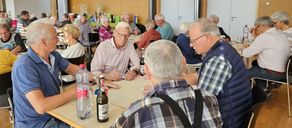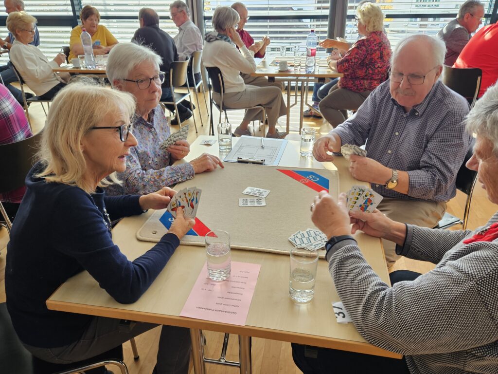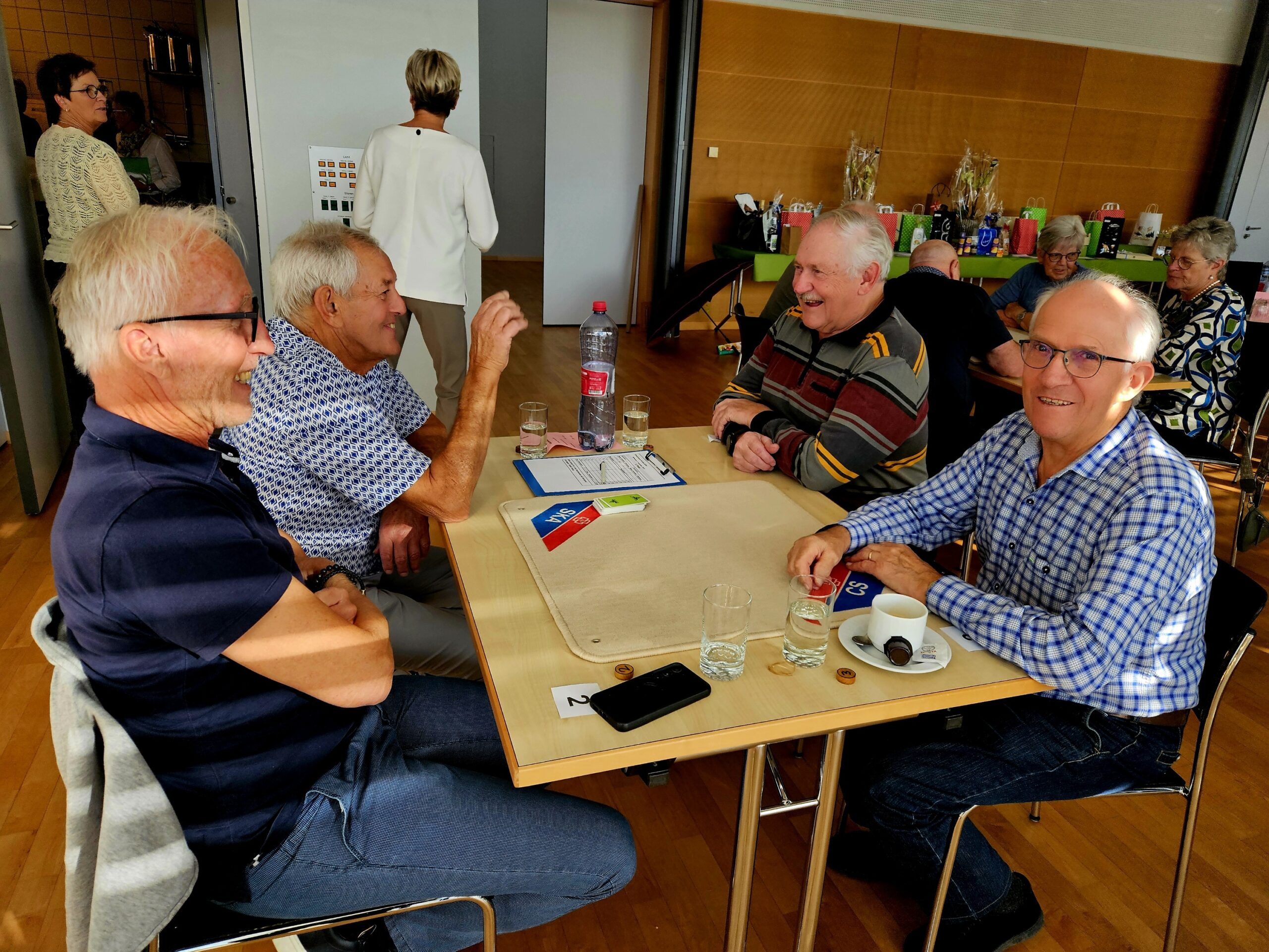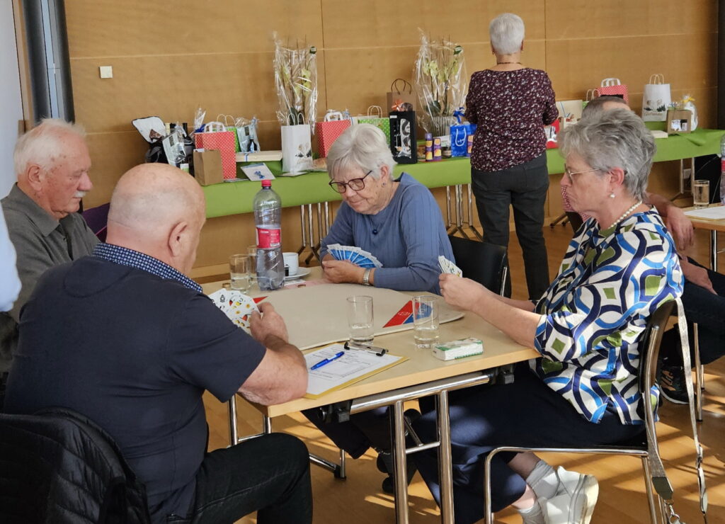 Gespielt wurden vier Passen zu acht Spielen, einfach gezählt. Nach jeder Passe sammelten die fleissigen Helferinnen und Helfer die Blätter mit den Punkten ein, es wurden neue Nummern gezogen – und schon wechselten die Spielerinnen und Spieler wieder den Tisch. So kam man immer wieder mit neuen Jass-Partnerinnen und -Partner zusammen, was für gute Stimmung sorgte.